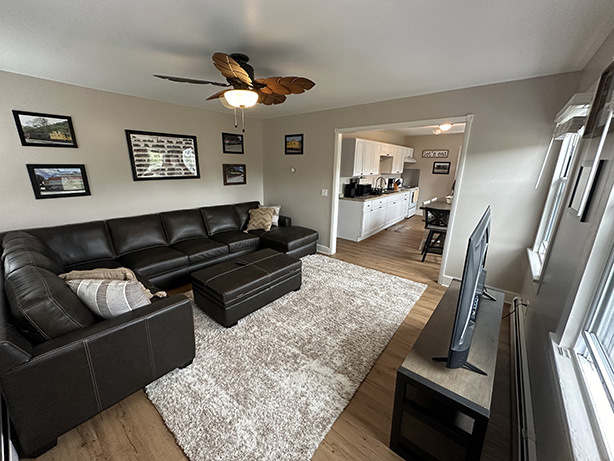 The second queen bedroom is part of a sleek, contemporary space that includes a full kitchen, a second full bathroom, and a spacious, open-concept living room. The living room features a comfortable pull-out couch, allowing the space to accommodate up to six guests. Step onto the expansive outdoor deck to soak in the river and mountain views or fire up the BBQ grill for a perfect outdoor dining experience.